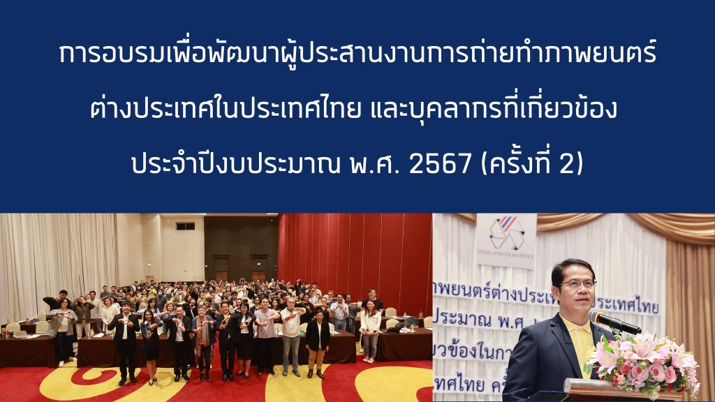“การอบรมเพื่อพัฒนาผู้ประสานงานการถ่ายทำภาพยนตร์ต่างประเทศในประเทศไทย และบุคลากรที่เกี่ยวข้อง ประจำปีงบประมาณ พ.ศ. 2567 ครั้งที่ 2” วันพฤหัสบดีที่ 25 กรกฎาคม 2567 เวลา 09.00 น. อธิบดีกรมการท่องเที่ยวมอบหมายให้ นายบุญเสริม ขันแก้ว รองอธิบดีกรมการท่องเที่ยว เป็นประธานเปิดการอบรมเพื่อพัฒนาผู้ประสานงานการถ่ายทำภาพยนตร์ต่างประเทศในประเทศไทย และบุคลากรที่เกี่ยวข้อง ประจำปีงบประมาณ พ.ศ. 2567 เรื่อง วิธีการ ขั้นตอน กฎ และระเบียบที่เกี่ยวข้องในการขออนุญาตถ่ายทำภาพยนตร์ต่างประเทศในประเทศไทย จัดขึ้นระหว่างวันที่ 25 – 26 กรกฎาคม 2567 โดยมี ผู้แทนหน่วยงานที่เกี่ยวข้อง ผู้ประกอบการ และบุคลากรด้านอุตสาหกรรมภาพยนตร์ เข้าร่วมการอบรม ณ โรงแรมเซ็นทารา ไลฟ์ ศูนย์ราชการและคอนเวนชันเซ็นเตอร์ แจ้งวัฒนะ กรุงเทพมหานคร Post navigation ขอร่วมแสดงความยินดีกับอุทยานประวัติศาสตร์ภูพระบาท จ.อุดรธานี ที่ได้รับการประกาศขึ้นทะเบียน มรดกทางวัฒนธรรมแห่งที่ 5 จากยูเนสโกลวดลายกราฟผ้าซิ่นตีนจก รางวัลชนะเลิศ การประกวดออกแบบผ้าทอ ผ้าซิ่นแห่งนครเชียงใหม่ โดยสมาคมสตรีนครเชียงใหม่