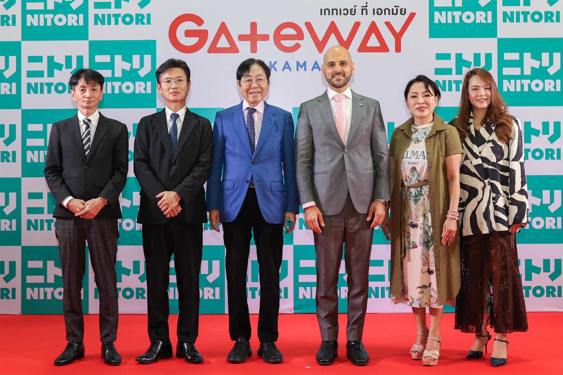 นายอากิโอะ นิโตริ ประธานกรรมการและประธานเจ้าหน้าที่บริหาร บริษัท นิโตริ โฮลดิ้งส์ จำกัด (Nitori Holdings Co., Ltd.) (ที่สามจากซ้าย) เครือธุรกิจค้าปลีกเฟอร์นิเจอร์และของตกแต่งบ้านชื่อดังจากเมืองซัปโปโร ประเทศญี่ปุ่น เป็นประธานในพิธีเปิด นิโตริ สาขาใหม่ ณ ชั้น 1 ศูนย์การค้าเกทเวย์ เอกมัย