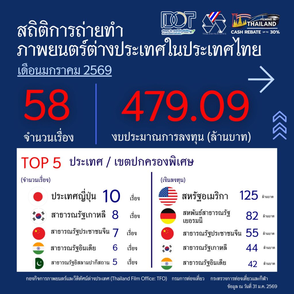 เฉพาะเดือนมกราคม 2569 มีภาพยนตร์ต่างประเทศเข้ามาถ่ายทำในประเทศไทย รวม 58 เรื่อง