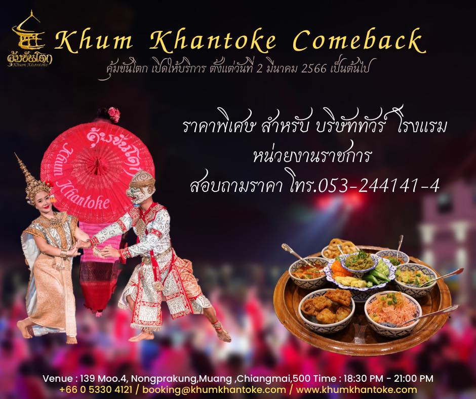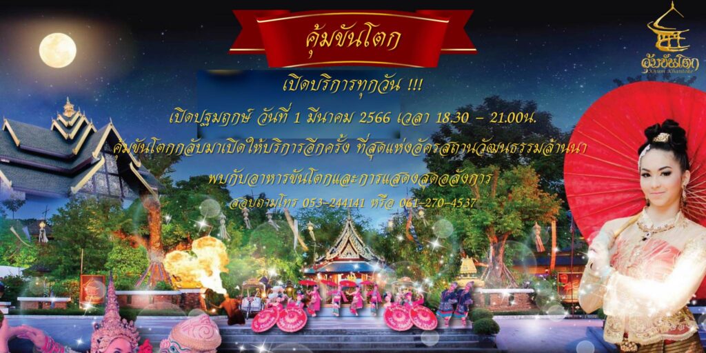 ตั้งแต่วันที่ 1 มีนาคม 2566 พบกับการแสดงสุดอลังการฉบับล้านนาและอาหารขันโตกพื้นเมือง แล้วพบกันที่ @คุ้มขันโตก เวลา 18:30-21:00 น.ทุกวัน