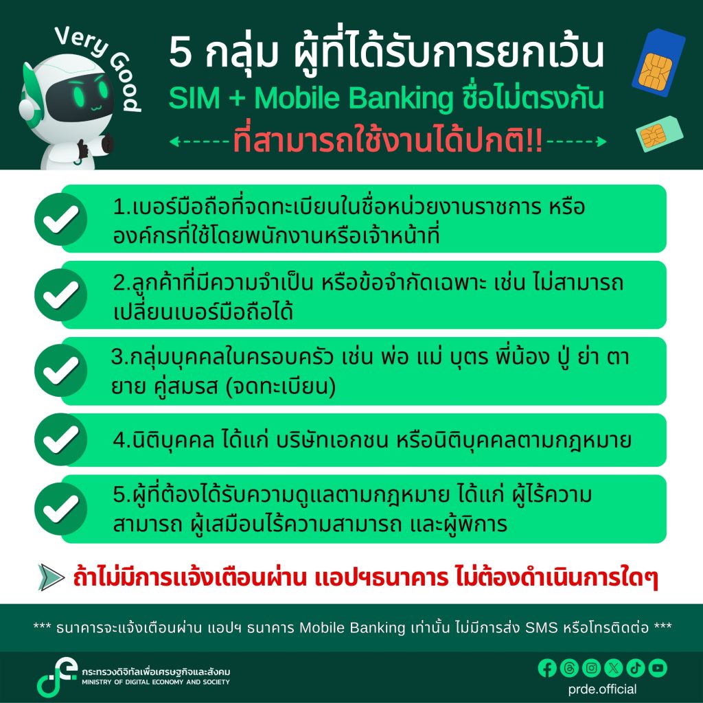 กระทรวงดิจิทัลเพื่อเศรษฐกิจและสังคม ระบุถึง 5 กลุ่ม ที่ได้รับการยกเว้น กรณีเบอร์มือถือ และ โมบายแบงก์กิ้ง ชื่อไม่ตรงกัน สามารถใช้งานได้ปกติ มีดังนี้
