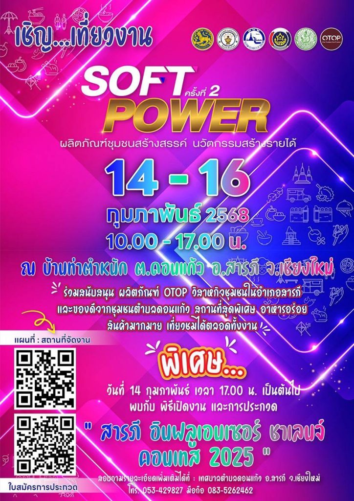 🎤 วิธีการประกวดแข่งขัน : โปรโมทหรือแนะนำผลิตภัณฑ์วิสาหกิจชุมชน และ ผลิตภัณฑ์สินค้า OTOP ของอำเภอสารภี ให้เป็นที่รู้จักกันอย่างแพร่หลาย เพื่อส่งเสริมด้านการตลาดของผลิตภัณฑ์ชุมชน ผ่านเวทีการประกวดในวันศุกร์ที่ 14 กุมภาพันธ์ 2568 เวลา 17.00 น. ณ บ้านท่าตำหนัก หมู่ที่ 1 ตำบลดอนแก้ว อำเภอสารภี จังหวัดเชียงใหม่