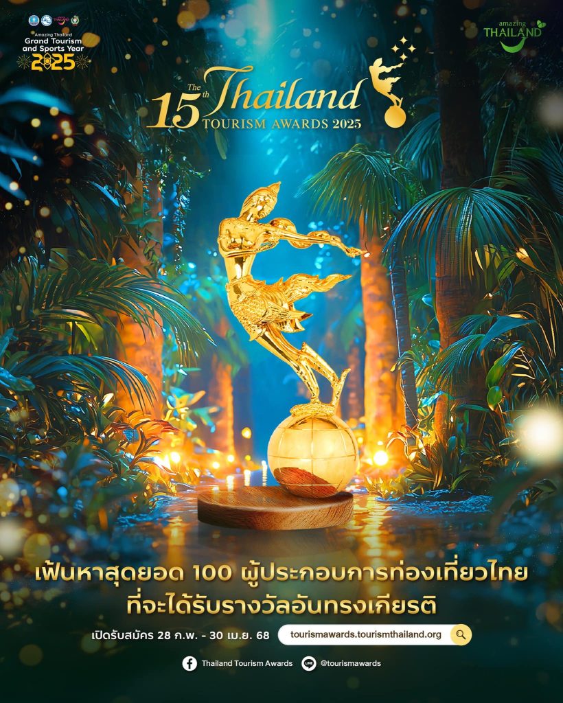 การท่องเที่ยวแห่งประเทศไทย (ททท.) ขอเชิญผู้ประกอบการด้านการท่องเที่ยว และองค์กรสนับสนุนการท่องเที่ยวยั่งยืน เข้าร่วมการประกวดรางวัลอุตสาหกรรมท่องเที่ยวไทย (Thailand Tourism Awards) ครั้งที่ 15 ประจำปี 2568 เพื่อยกระดับมาตรฐานการท่องเที่ยวไทยสู่ความยั่งยืน ตามยุทธศาสตร์ STGs (Sustainable Tourism Goals)