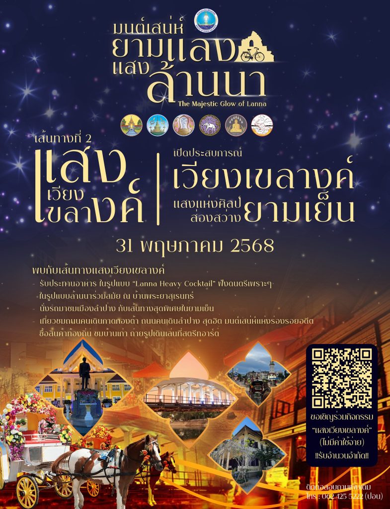 มนต์เสน่ห์ยามแลง แสงล้านนา” กิจกรรมภายใต้โครงการส่งเสริมการท่องเที่ยวเมืองเก่าอารยธรรมล้านนา จัดโดย สำนักงานการท่องเที่ยวและกีฬาจังหวัดเชียงใหม่ เส้นทางที่ 2 : แสงเวียงเขลางค์ : จังหวัดลำปาง กิจกรรมดี ๆ ที่ผสานวัฒนธรรมล้านนาเข้ากับแสงเวียงเขลางค์ รับประทานอาหาร ในรูปแบบ “Lanna Heavy Cocktail” ฟังดนตรีเพราะๆ ในรูปแบบล้านนาร่วมสมัย ณ บ้านพระยาสุเรนทร์ นั่งรถมาชมเมืองลำปาง กับเส้นทางสุดพิเศษในยามเย็น เที่ยวชมถนนคนเดินกาดกองต้า ถนนคนเดินลำปาง สุดฮิต มนต์เสน่ห์แห่งร่องรอยอดีตซื้อสินค้าท้องถิ่น ชมบ้านเก่า ถ่ายรูปเดินเล่นที่สตรีทอาร์ต ยามเย็นวันเสาร์ที่ 31 พ.ค. เวลา 16:00น. เป็นต้นไป มาร่วมเดินทางชมแสงเวียงเขลางค์ จุดนัดพบ : บ้านพระยาสุเรนทร์ (จอดรถที่สถานีรถไฟนครลำปาง)ลงทะเบียนได้ที่นี่ : https://docs.google.com/…/16LgJVVhoJ_PgvVA…/viewform…(รับจำนวนจำกัด ลงทะเบียนเข้าร่วมกิจกรรมไม่มีค่าใช้จ่าย)สอบถามรายละเอียดเพิ่มเติม โทร 0631468143ลงทะเบียนเพื่อเข้าร่วมกิจกรรม”แสงเวียงเขลางค์” ได้ที่นี่ ดูน้อยลง Post navigation รมว.ท่องเที่ยวและกีฬา เปิดงาน “Thai Fists in Thai Fest” กลางกรุงปารีส ดันมวยไทยสู่เวทีโลก หนุน Soft Power ไทยสร้างแรงบันดาลใจนักท่องเที่ยว หวานไม่ลืมในเมืองหมอกแม่ฮ่องสอน ชวนลิ้มลองขนมโบราณไทใหญ่ที่หากินที่อื่นไม่ได้