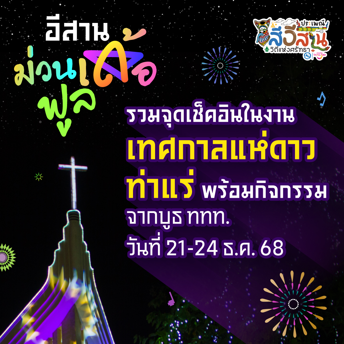 รวมจุดเช็คอิน ถ่ายรูปเท่ๆ ในงาน “เทศกาลแห่ดาว ท่าแร่” จ.สกลนคร ที่ให้เพื่อนๆ ได้พาครอบครัว คนรัก คนพิเศษ มาเที่ยวสนุกๆ พร้อมลุ้นรับของรางวัลจากบูธ ททท. กันอีกด้วย ร่วมม่วนเด้อฟูลกันได้ตั้งแต่วันที่ 21 – 24 ธันวาคม 2568 Post navigation ดอกไม้สวยหลากสี บานสะพรั่งบนดอยอินทนนท์ ในเดือนธันวาคม